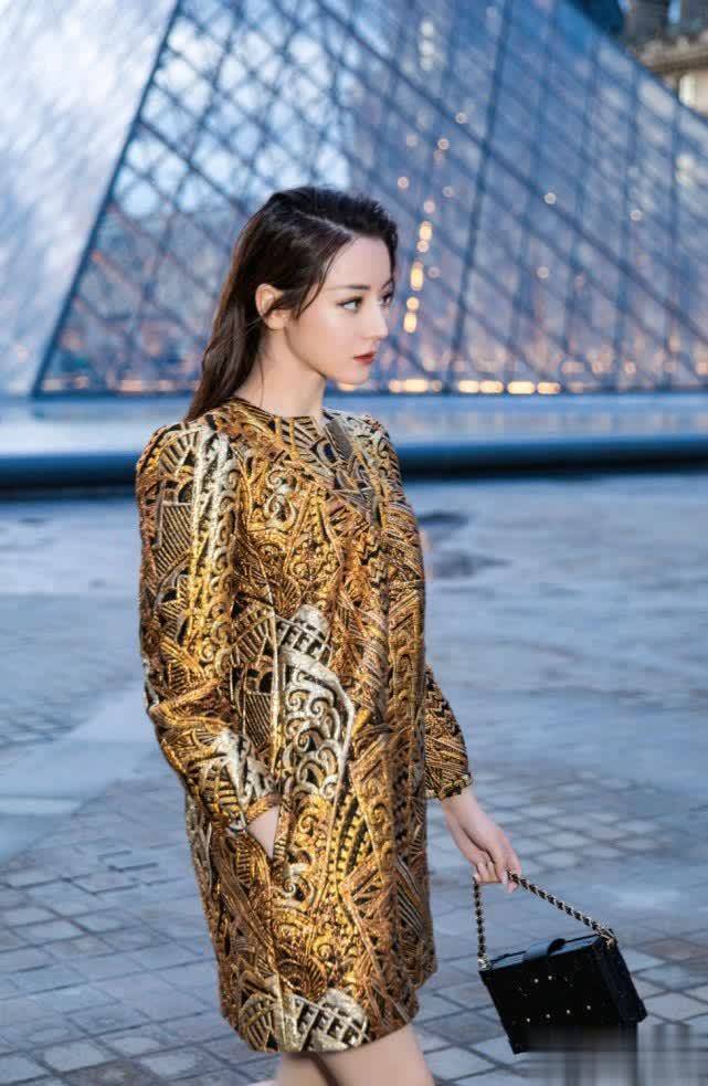 这是一条金色的连衣裙,采用了印花刺绣的图案设计,搭配了纯色的单调感,很有吸引力。大家都知道金色是很难驾驭的颜色,而且也有一种贵妇的气息,很容易穿出老气的样子。虽然迪丽热巴的颜值高、身材好,但是穿这种裙子还是不怎么适合,看着显老了几岁,不太像是27岁的女孩。